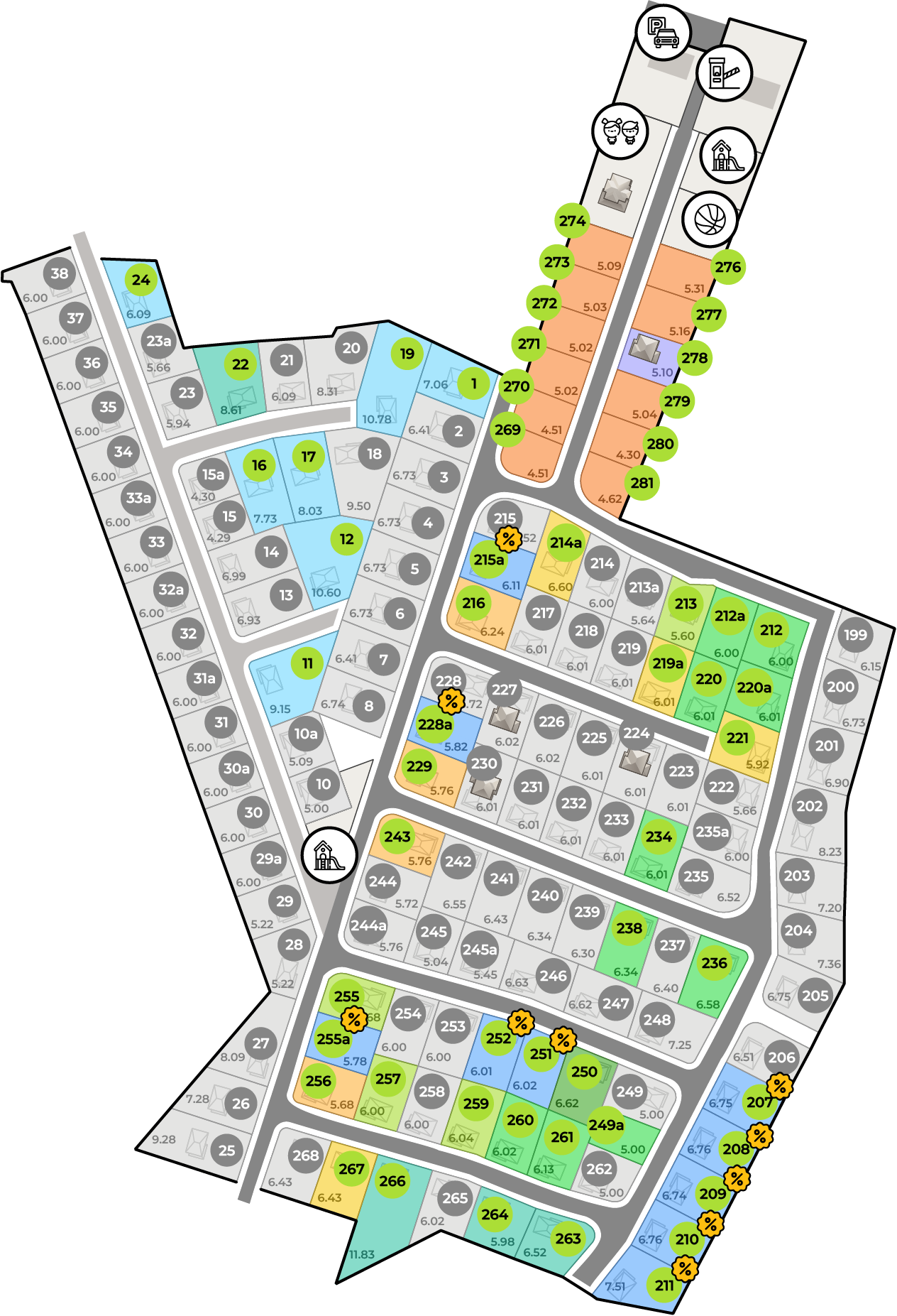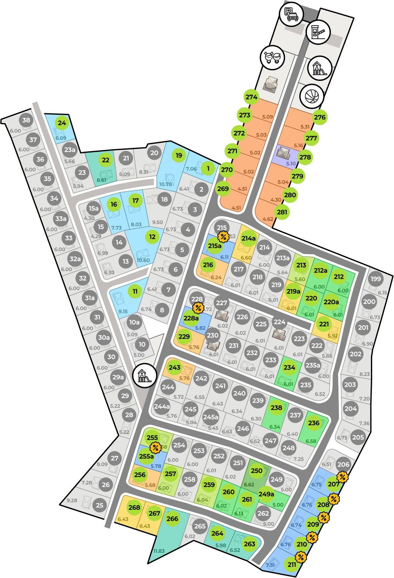 Магистральный газ, центральное электричество, водопровод и канализация подключены к участкам